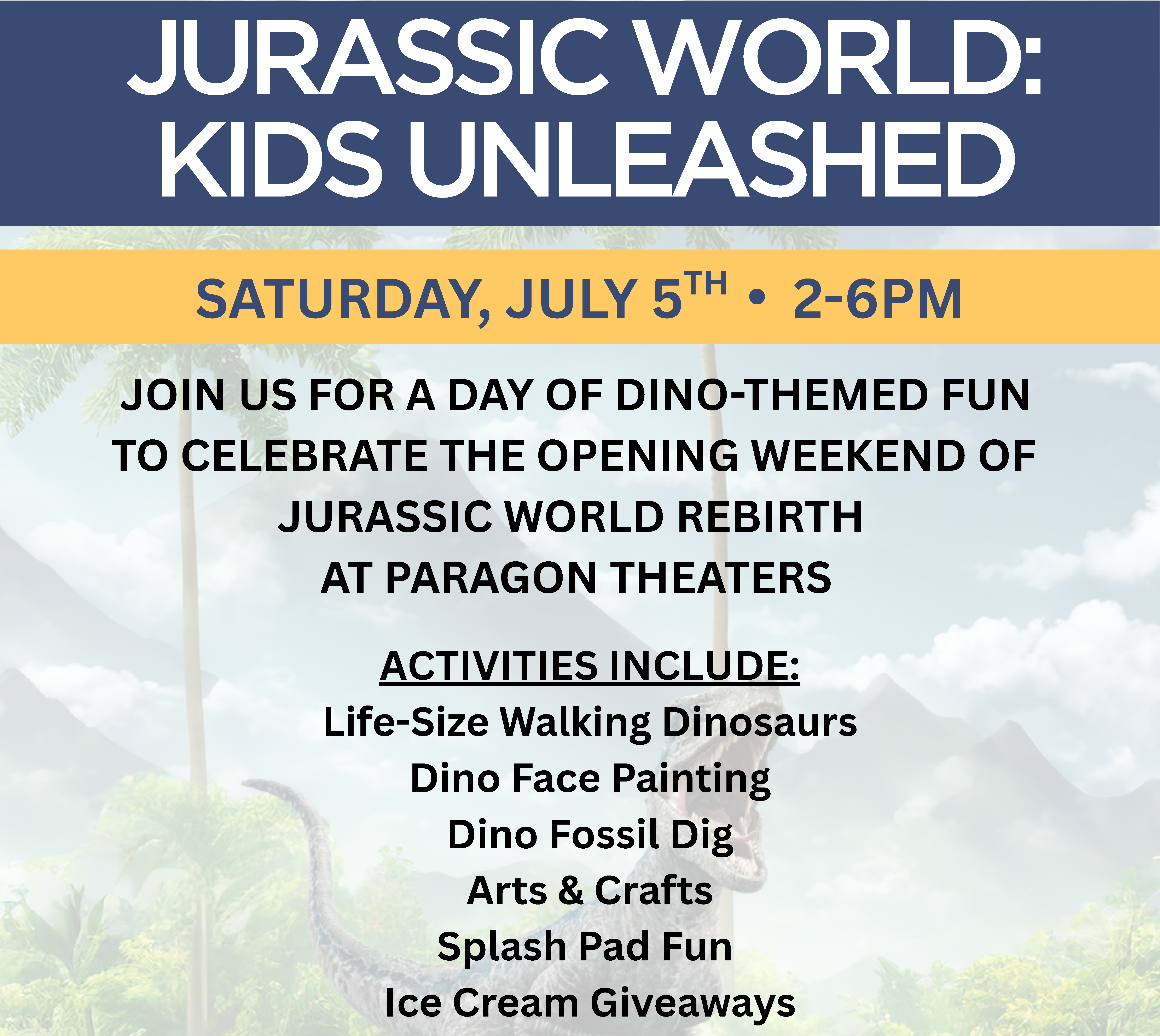 Get ready for a ROAR-some adventure at Founders Row! Join us for a day filled with dinosaur fun and excitement, as we celebrate the OPENING WEEK OF JURASSIC WORLD REBIRTH AT PARAGON THEATERS.